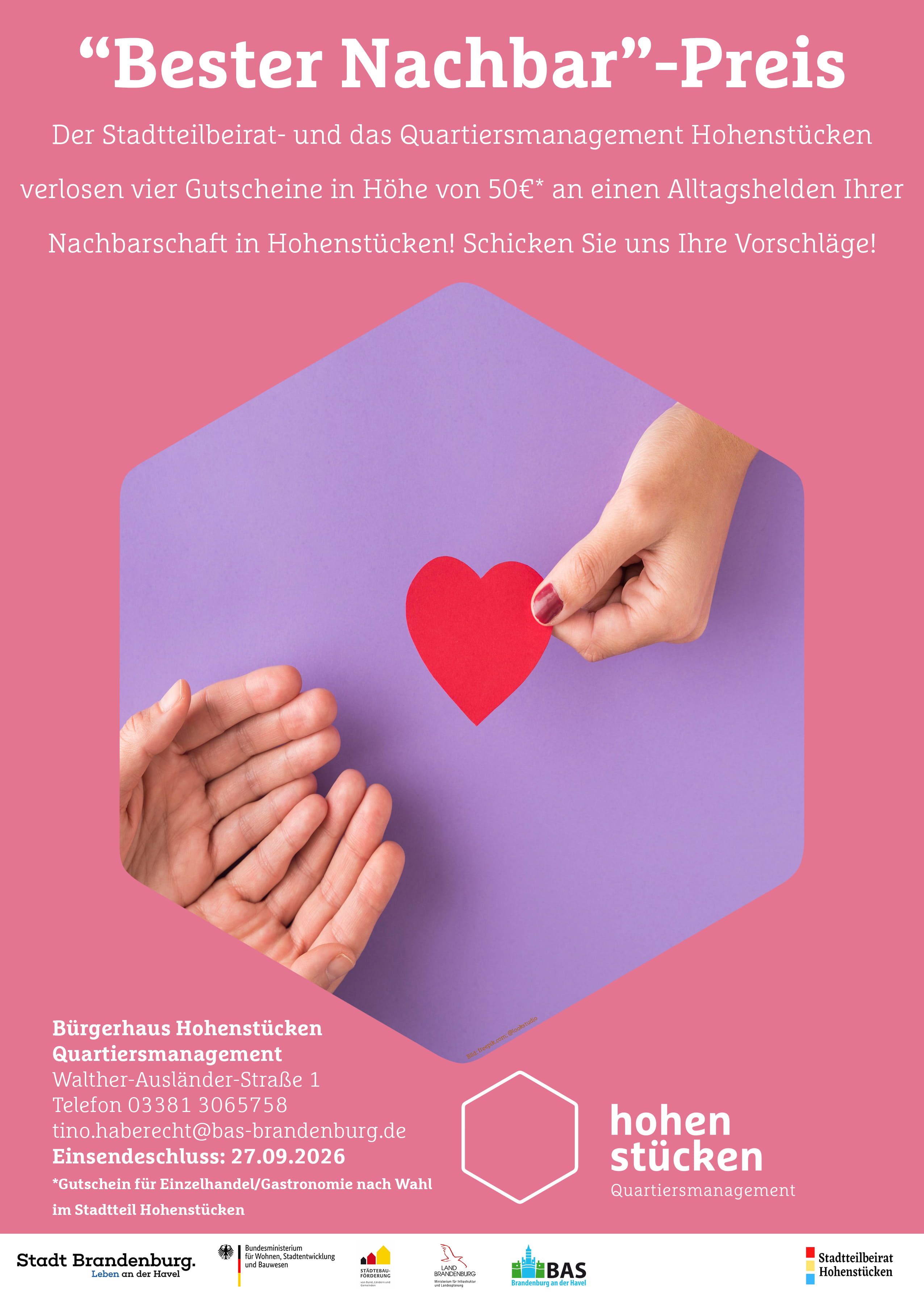 - Du fährst in den Urlaub und dein Nachbar kümmert sich um deine Blumen? Du bist nicht mehr gut zu Fuß und dein Nachbar kauft für dich ein? Dein Nachbar hat immer ein offenes Ohr für dich und hilft dir, wenn du Hilfe benötigst. Dann schlage ihn als „Bester Nachbar“ vor und gewinne für ihn einen von vier 50€-Gutscheine nach Wahl für den Einzelhandel/Gastronomie in Hohenstücken